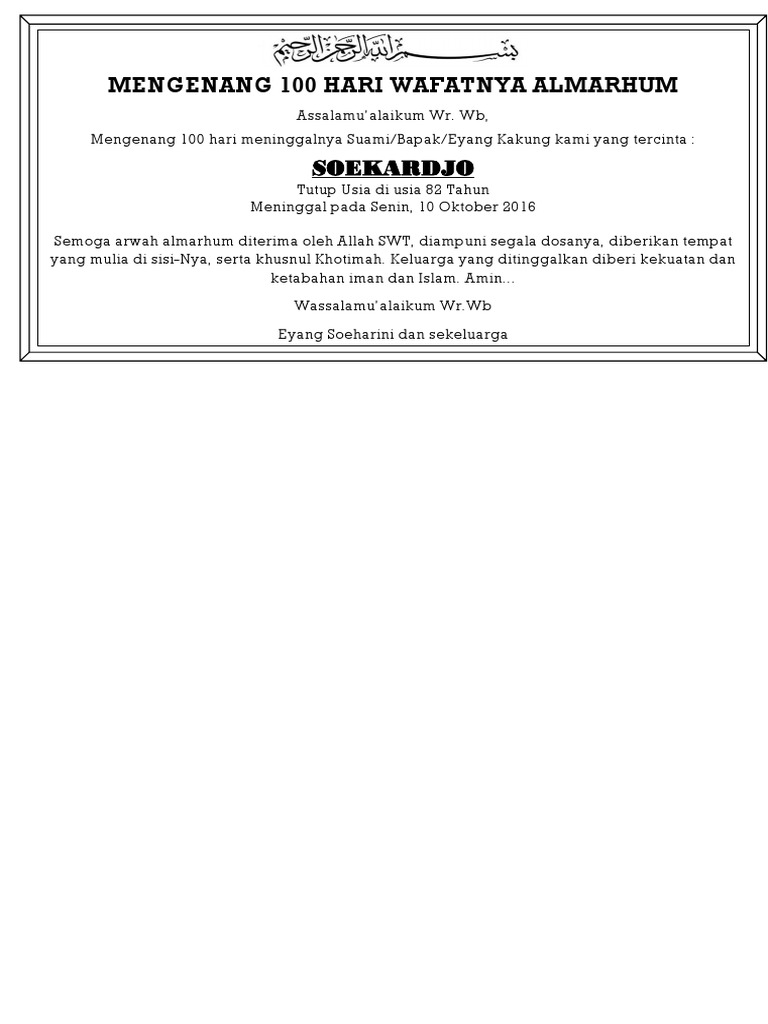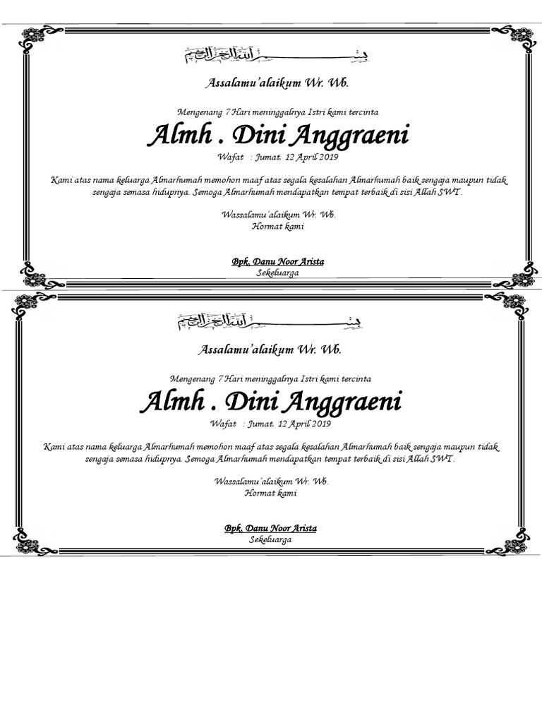 Contoh Tulisan Undangan Memperingati 7 Hari Meninggal Opera Timur from www.operatimur.com Maybe you would like to learn more about one of these? Check spelling or type a new query. We did not find results for: